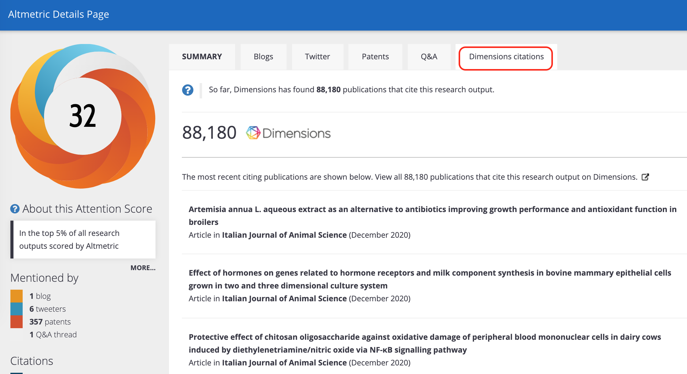 Dimensions citations on the Altmetric Details Page