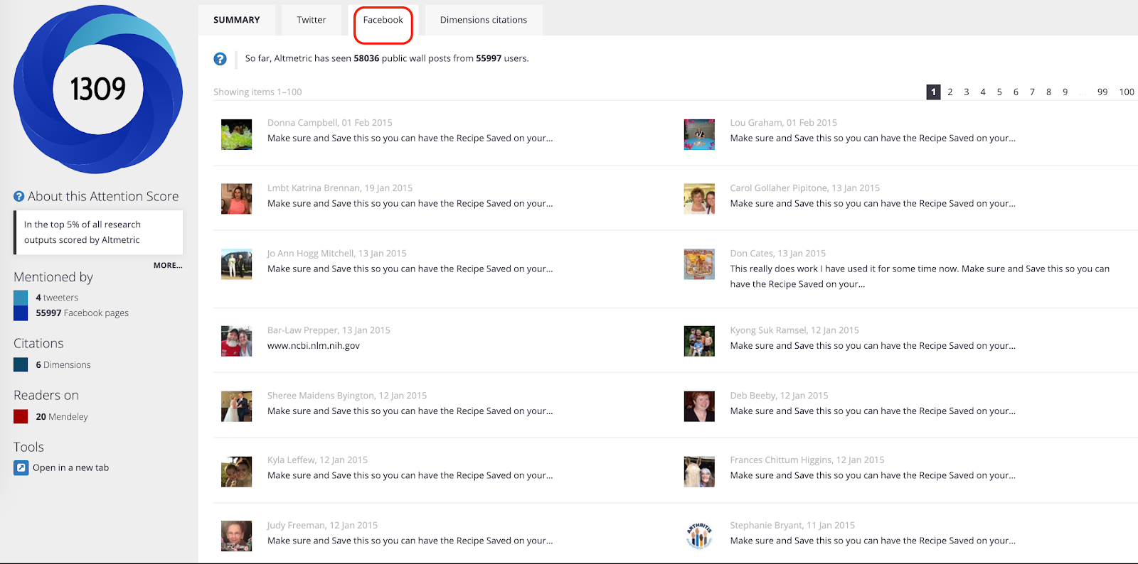 Facebook tab on an Altmetric Details Page