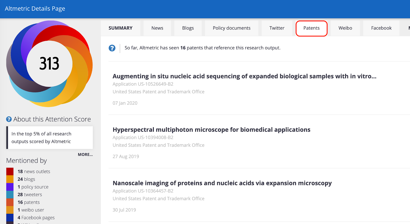 Any saved searches containing research outputs that have been mentioned by patents also display the patents data in email alerts and shareable reports. Mentions from patents can be exported from the Mentions tab, and also viewed in Altmetric APIs. CSV exports also contain patent mention counts.