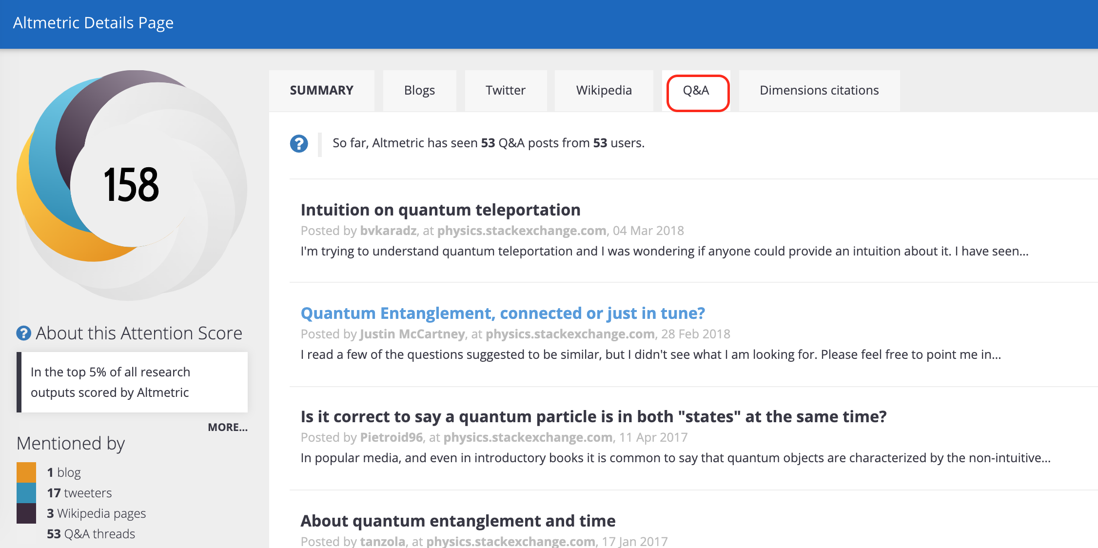 On an Altmetric Details Page, the Q&A tab lists mentions by time of publication in descending order, with the most recent ones available at the top of the page. You can see who posted the mention, on which forum, and the content of the post.