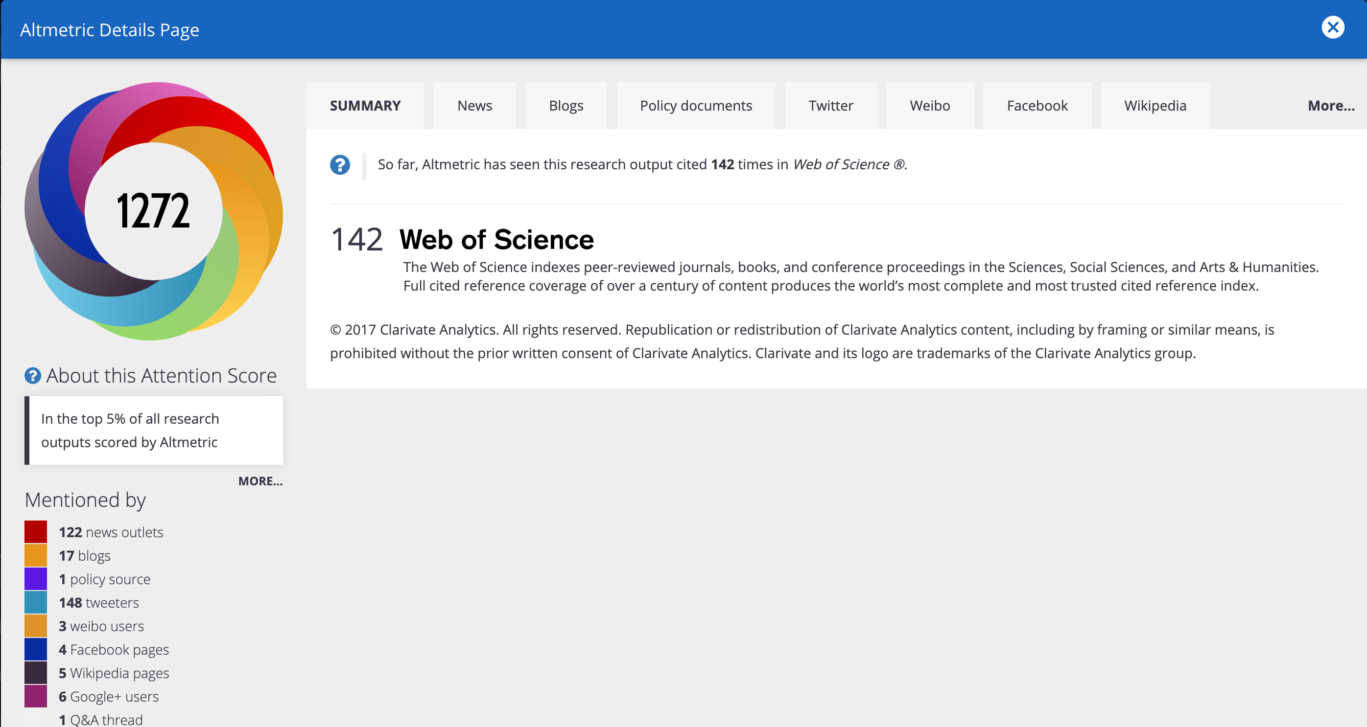Clarivate Analytics Web of Science™ citation data is available in the Altmetric Explorer for Web of Science subscribers.