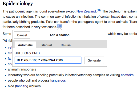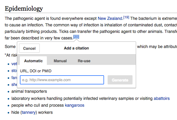 You should be able to find the reference to the article you want to add by searching for the title, Pubmed ID, DOI or other items from the paper. Our example Q Fever article includes the text: