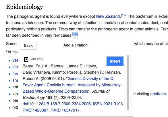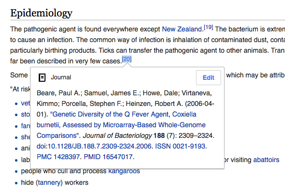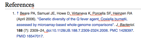 As an example, the Wikipedia page for Q Fever cites an article in the ASM Journal of Bacteriology.