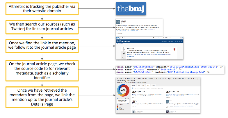 When a research output is mentioned in a source that Altmetric tracks, such as a policy document, our system visits the research output page to link up the attention. Altmetric looks at the source code of the research output page in order to collect the relevant metadata needed to identify the research output.