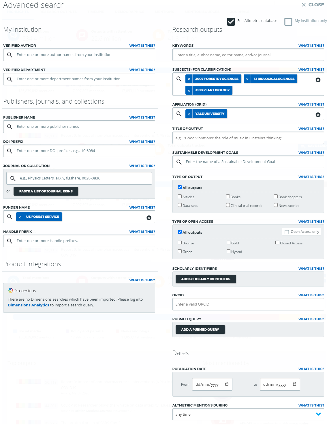 If you are an Altmetric Explorer for Institutions user, you can also select whether or not to search within your own institution's verified research outputs, or expand your search to the full Altmetric database. You can read more about this functionality here.