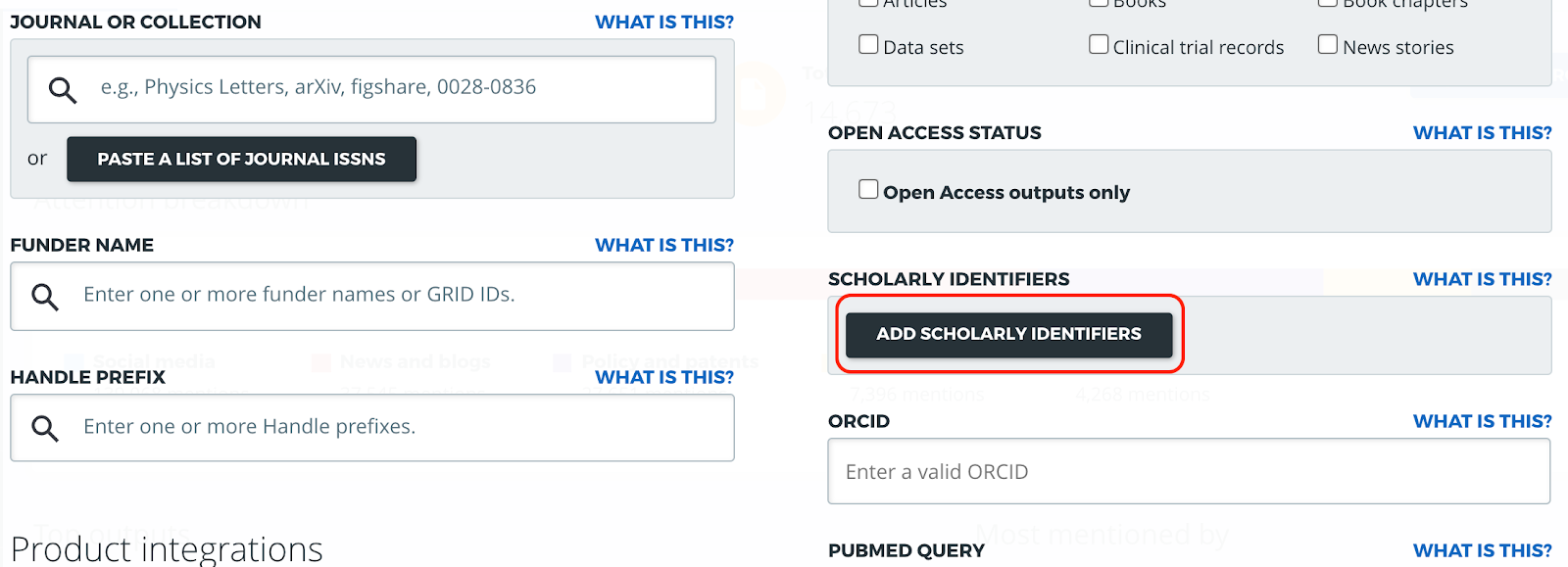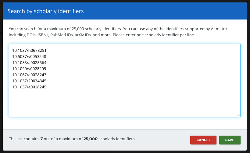 In the "Search by scholarly identifiers" window, you can add up to 25,000 of any type of identifier tracked by Altmetric. You can search by multiple types of identifiers (e.g DOI and arXiv) or just by one (e.g PMID).