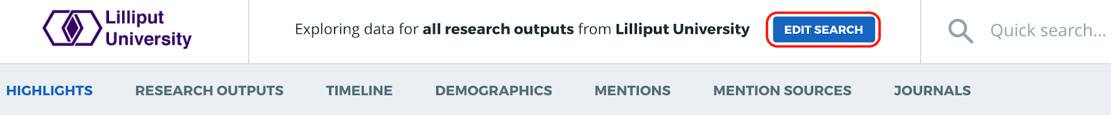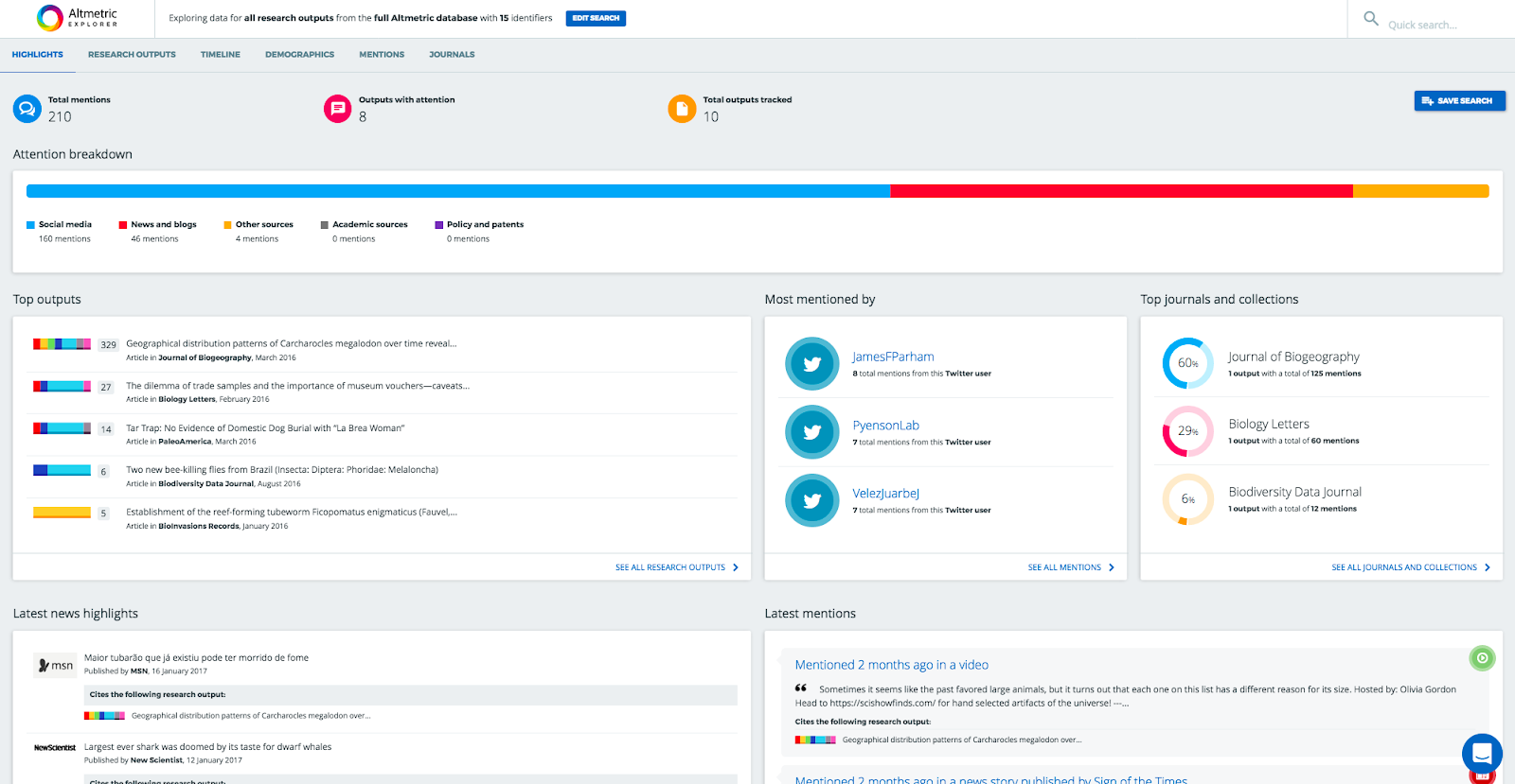 The results will appear in the Highlights section that shows how many outputs Altmetric knows about and how many of those outputs received mentions. You will then be able to navigate to the other tabs for an in-depth analysis.
