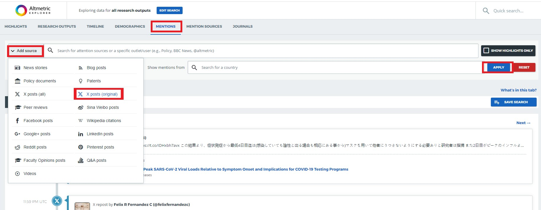 The Mentions tab of the Altmetric Explorer is one of the most powerful pages of the platform, as it allows users to view all of the individual mentions for any search query. We have added a Mentions tab filter which enables users to view original posts only, excluding reposts