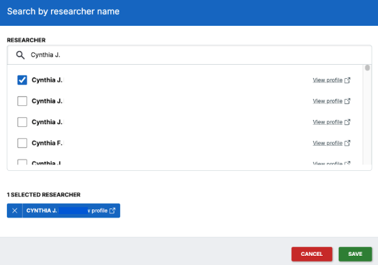 A pop-up allows you to search for researchers by name. You can use the Dimensions profile link to help distinguish between researchers with the same name. Once you’ve selected the correct researchers, you can add them to your search query and combine it with other filters.