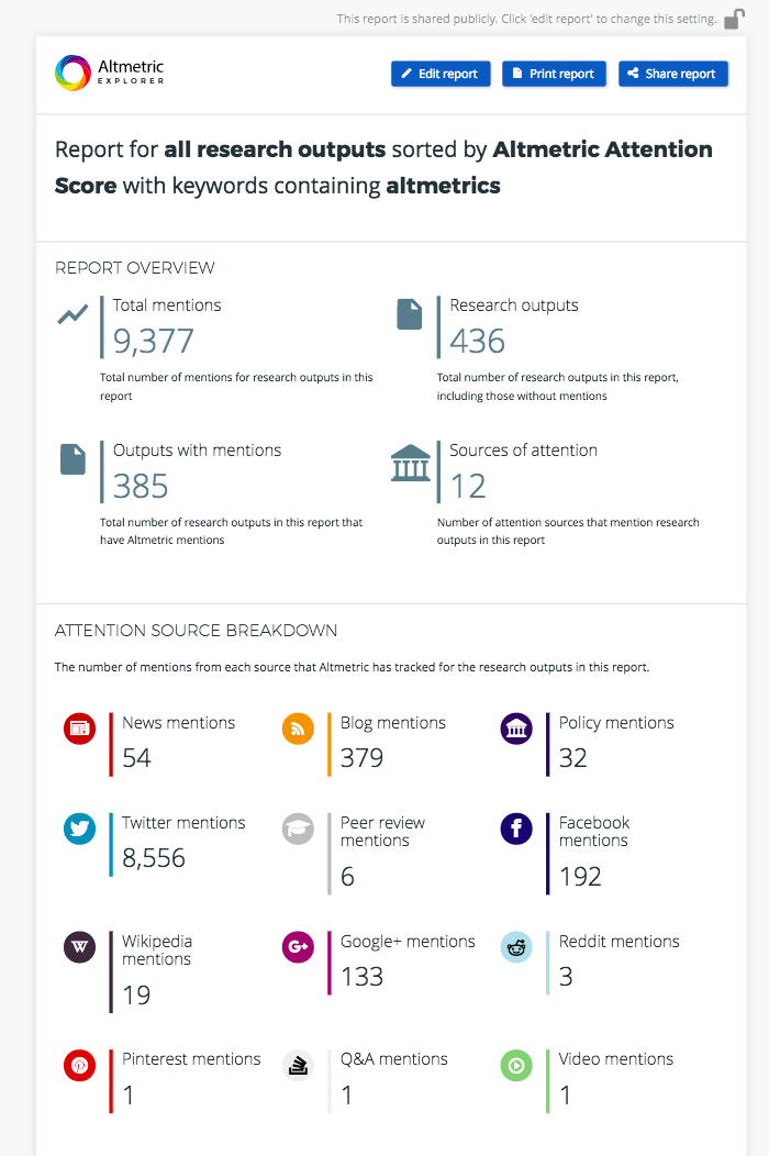 If you wish to share a custom report of your Altmetric attention data with others (including colleagues who do not have access to the Altmetric Explorer), you can create and send a Shareable Report.