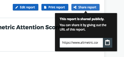 Once you have made your report public, you can get the URL for your report by copying it from the address bar of the window, or by clicking the "Share report" button. Once the report is public, anyone with the link can view the report, even if they don’t have Altmetric Explorer access. However, please note that search engines will not index the report.