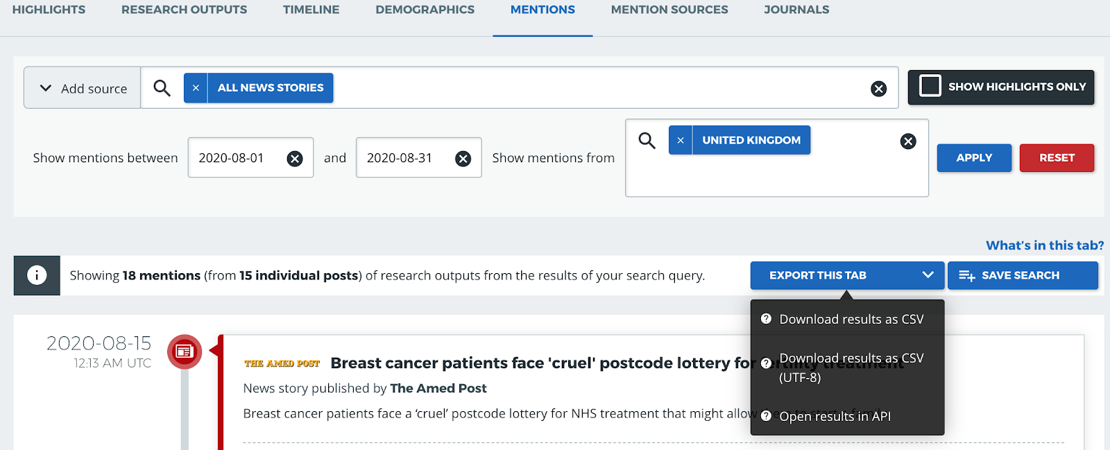 Altmetric supports the ability to export individual mentions from the Explorer. That means you can download a spreadsheet with information and links relating to individual news stories, policy documents, and other posts that have mentioned your research outputs. This advanced functionality allows users to investigate and evaluate qualitative attention data, by reviewing the mentions themselves.