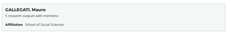 This "Affiliation" list is based on all of the lines in the publications file in which this author appears. For example, if Dr. Gallegati is listed on five lines with five different publications and those five publications are sorted into several different departments, Dr. Gallegati will appear as being affiliated with all of those departments. This may be inaccurate, since oftentimes a given publication will belong to several departments and several authors, even though all of those authors do not actually belong to all of those departments.