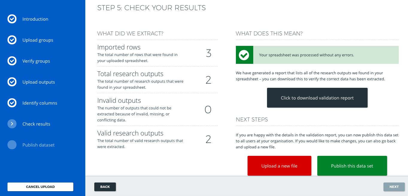 Upload a new file (red button): Select this if you uploaded the wrong publications spreadsheet file or realized that you needed to make changes. This takes you back to Step 3 (Upload Outputs)