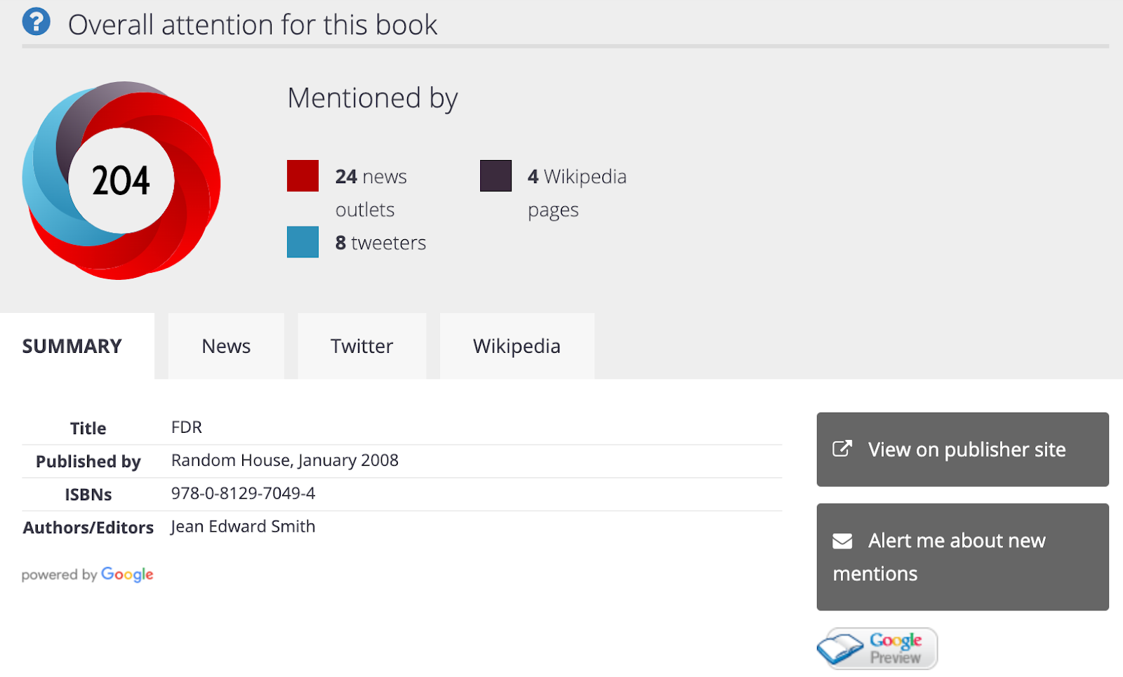 When we see a Google Books mention in any of our sources, we try to identify the book by sending a query to the Google Books API. The Google Books API returns all of our requested metadata (book title, authors/editors, and so on), which we then display in Altmetric details pages.