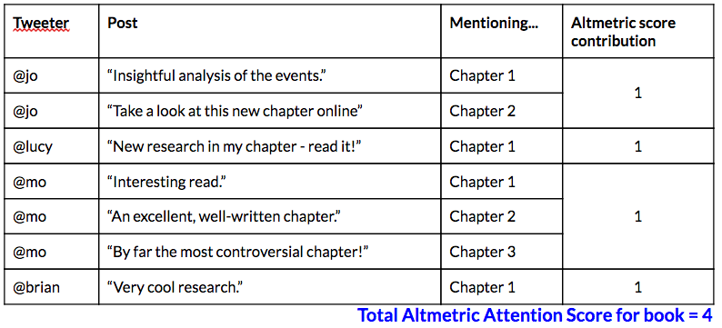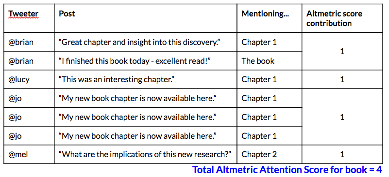 This book has both chapter and book level attention. Brian has posted on X about both a chapter and the book. Since he is an individual contributor to the attention score it is only counted once. Jo has posted about the same chapter various times, this will only contribute once to the overall attention score.