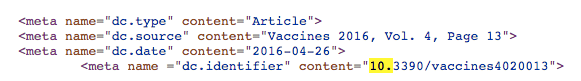 You can see the DOI on the webpage above. Below you can see the source code for this journal article, the DOI is embedded in the last line of the metatags.