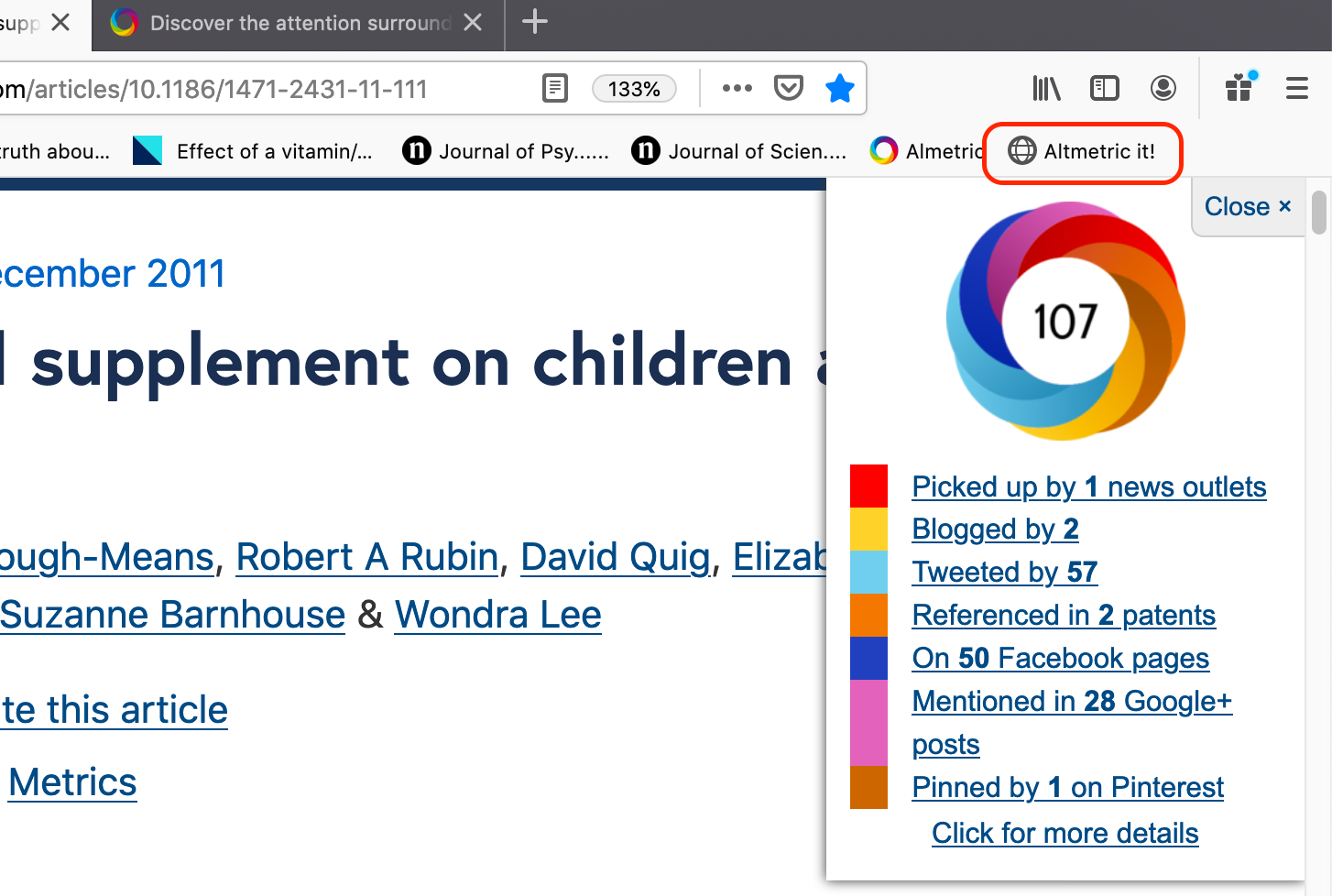 First, the Bookmarklet shows you the Altmetric donut, which is colour-coded according to which sources have mentioned the article.