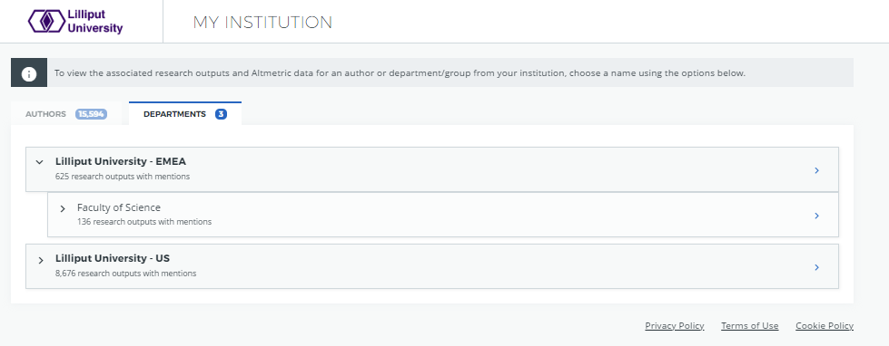 If your repository doesn’t accurately represent your organization's hierarchical structure, for example you want to limit what departments you can see in the Explorer or you want to use different wording - not to worry. Here at Altmetric we’re able to configure your EFI integration to support reading your departmental structure from an external service rather than taking it directly from your OAI-PMH feed - giving you the freedom and control to see exactly what you want in the way that makes the most sense.