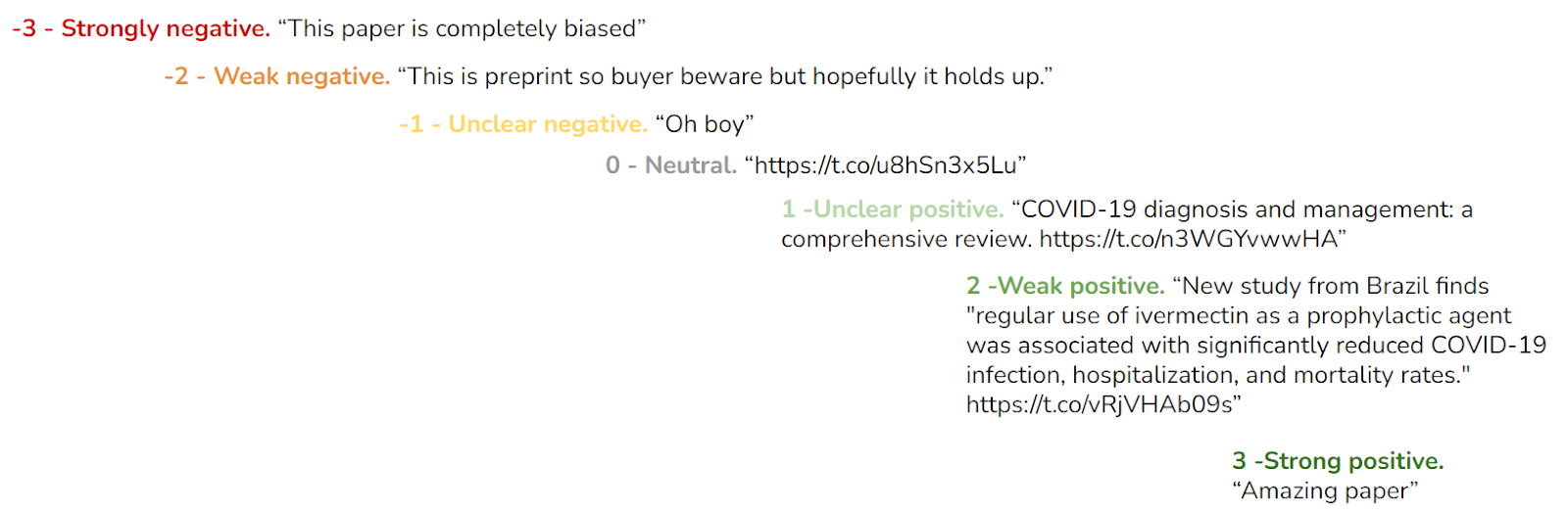 Our processes uses AI and keyword analysis to calculate a strength of recommendation, which is scored on a scale from +3 (Strongly Positive) to -3 (Strongly Negative). +1 and -1 are Weakly Strong / Negative, and 0 is Neutral - typically this is when people only post the title or link, with no commentary. The process takes into account the title of the publication, and looks for additional content.