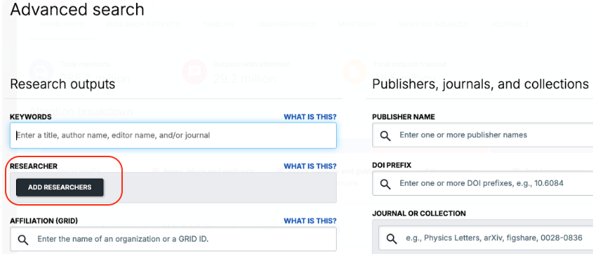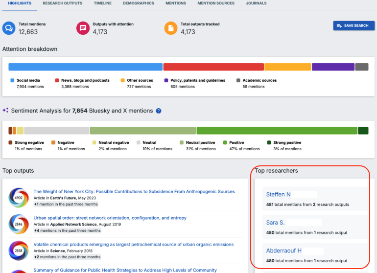 After you apply your search, the Highlights tab will show you all the data and outputs related to that specific researcher. You can also view a timeline of the aggregated attention or explore individual mentions of their work.