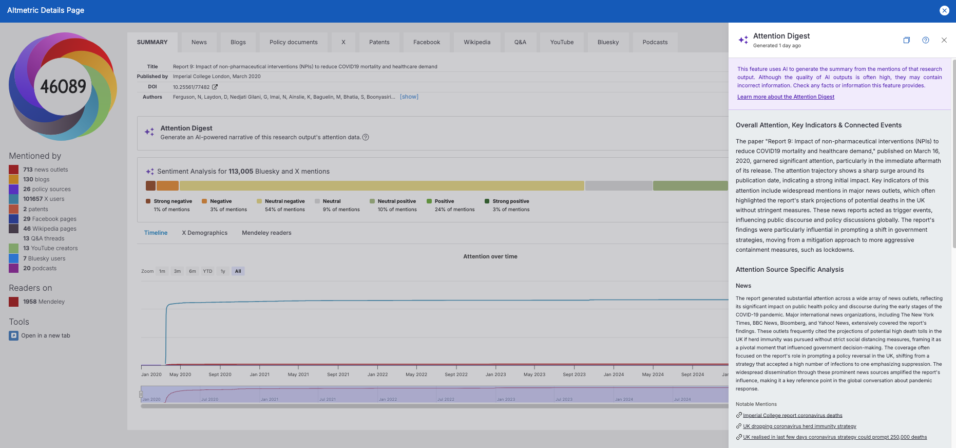 The Altmetric Attention Digest is an AI-powered feature designed to move beyond simple attention metrics and provide users with a clear, concise, and narrative summary of a research output's attention data.